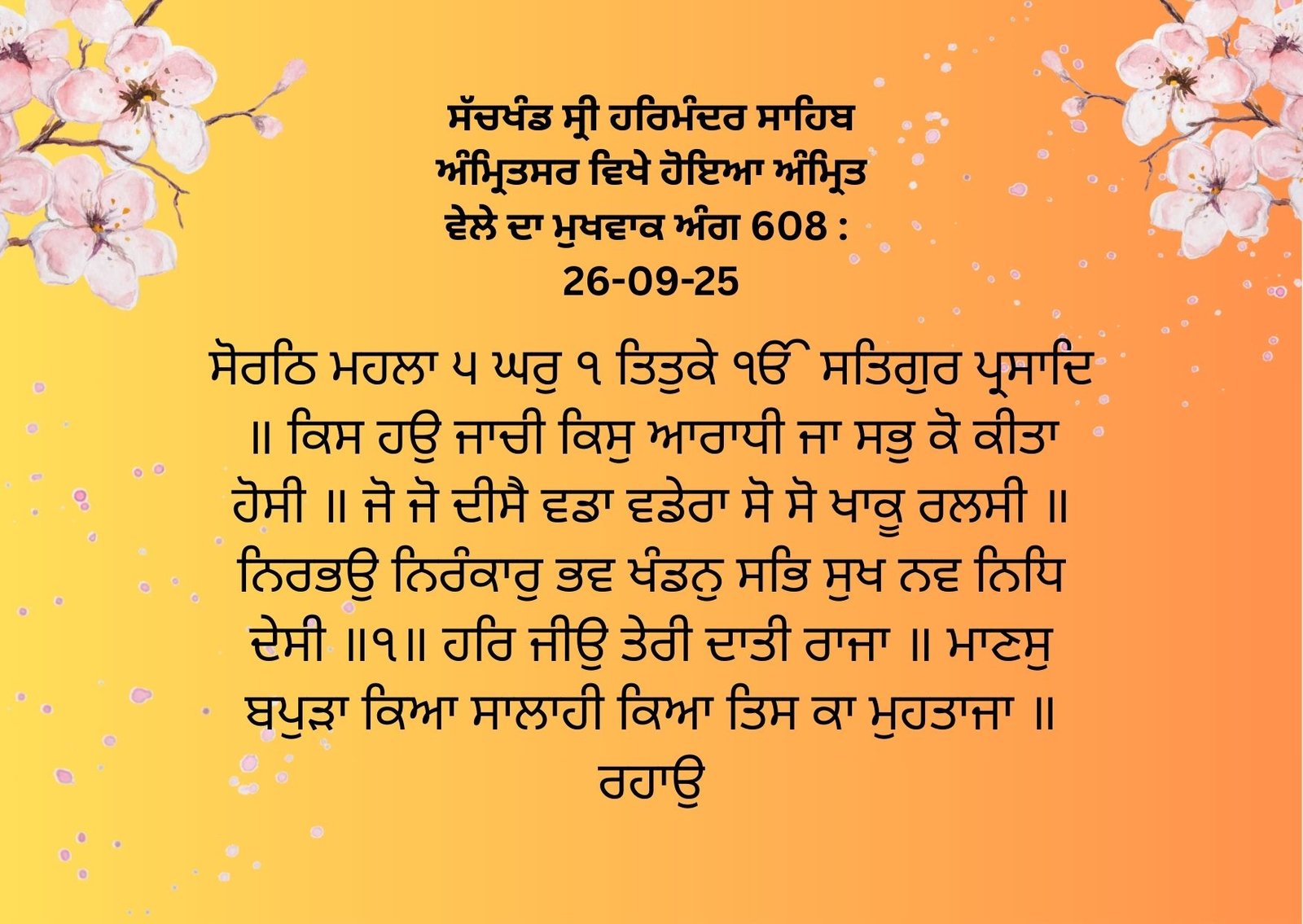 Sachkhand Sri Harmandir Sahib Amritsar Vikhe Hoyea Amrit Wele Da Mukhwak Ang 608: 26-09-25