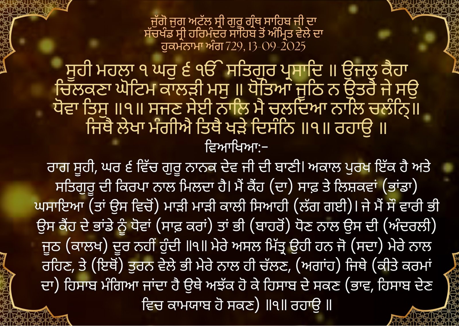ੴ ਸਤਿਗੁਰ ਪ੍ਰਸਾਦਿ ॥ ਉਜਲੁ ਕੈਹਾ ਚਿਲਕਣਾ ਘੋਟਿਮ ਕਾਲੜੀ ਮਸੁ ॥ ਧੋਤਿਆ ਜੂਠਿ ਨ ਉਤਰੈ ਜੇ ਸਉ ਧੋਵਾ ਤਿਸੁ ॥੧॥