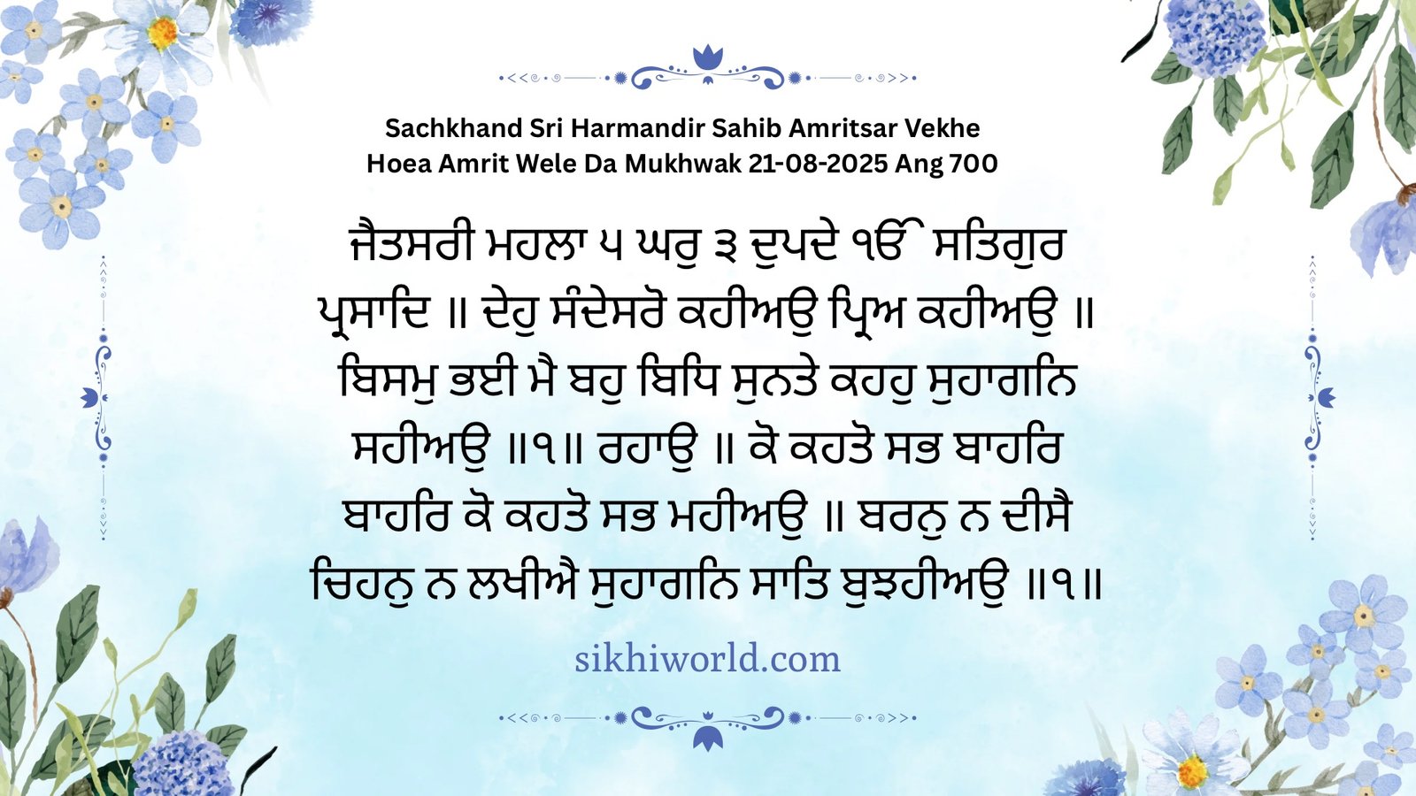 Sachkhand Sri Harmandir Sahib Amritsar Vekhe Hoea Amrit Wele Da Mukhwak 21-08-2025 Ang 700