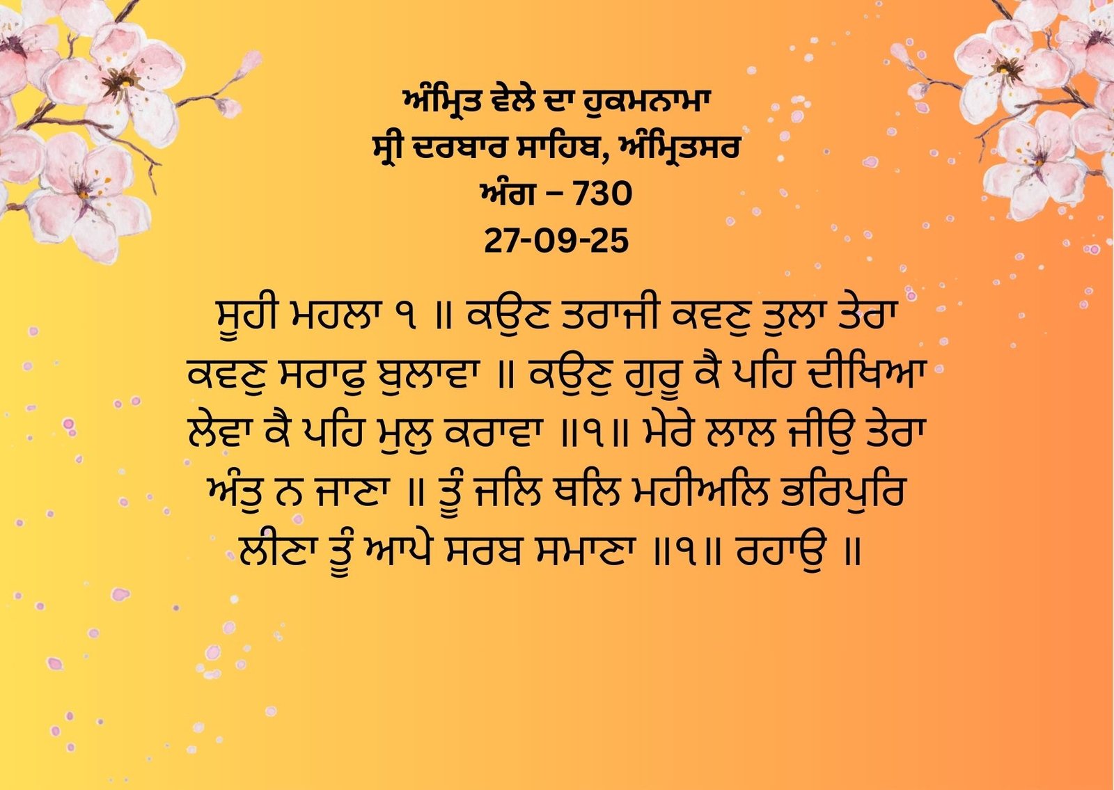 Amrit Vele Da Hukamnama Sri Darbar Sahib, Amritsar, Date 27-09-2025 Ang 730