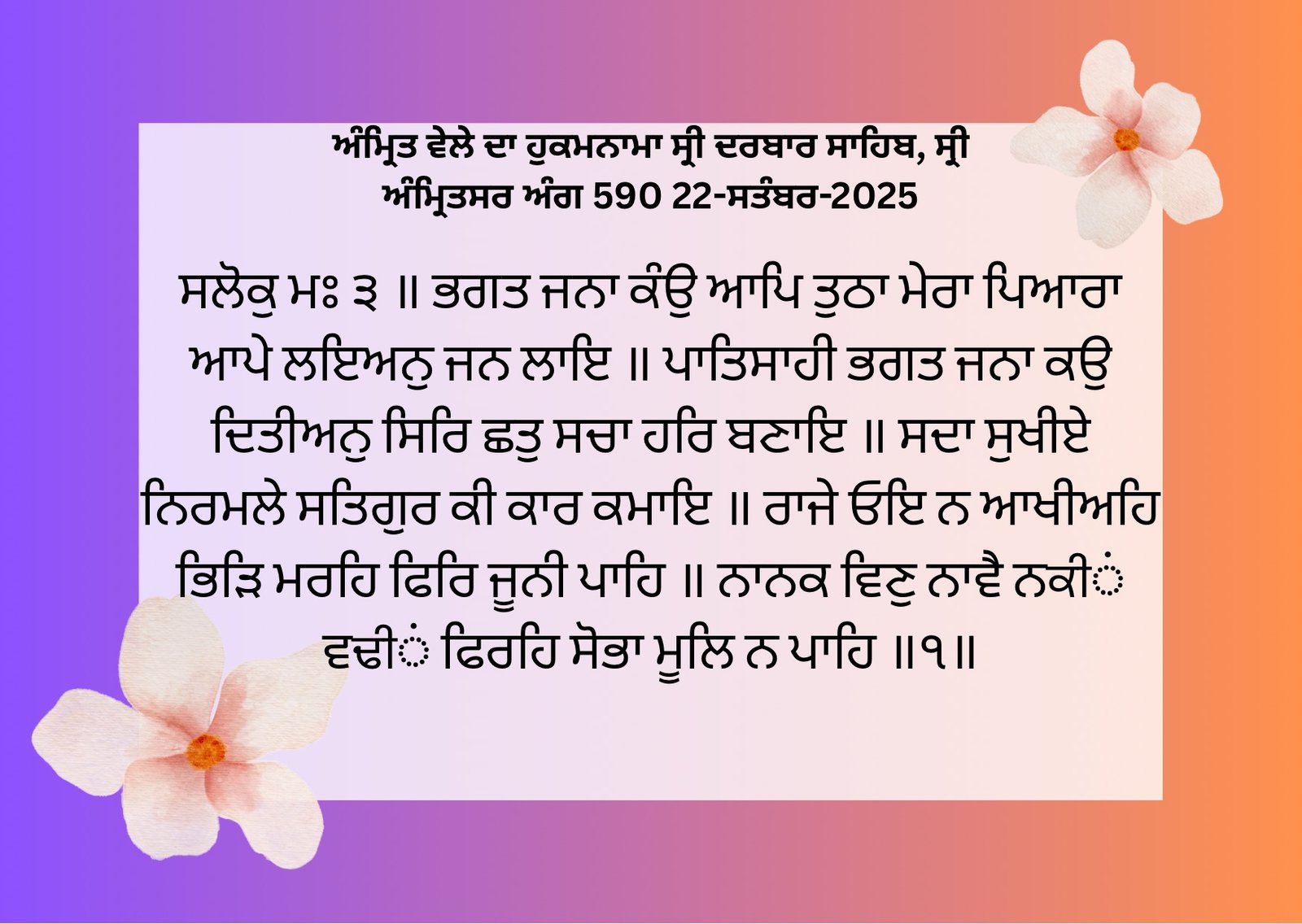 Amrit Vele Da Hukamnama Sri Darbar Sahib, Amritsar, Date 22-09-2025 Ang 590